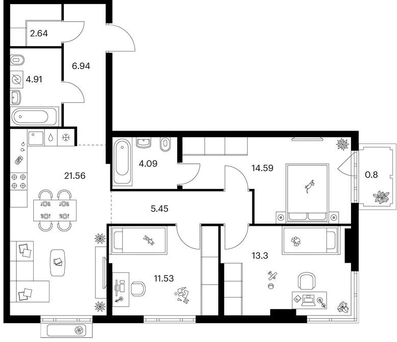 Трехкомнатные квартиры (9 квартир, 6 планировок)