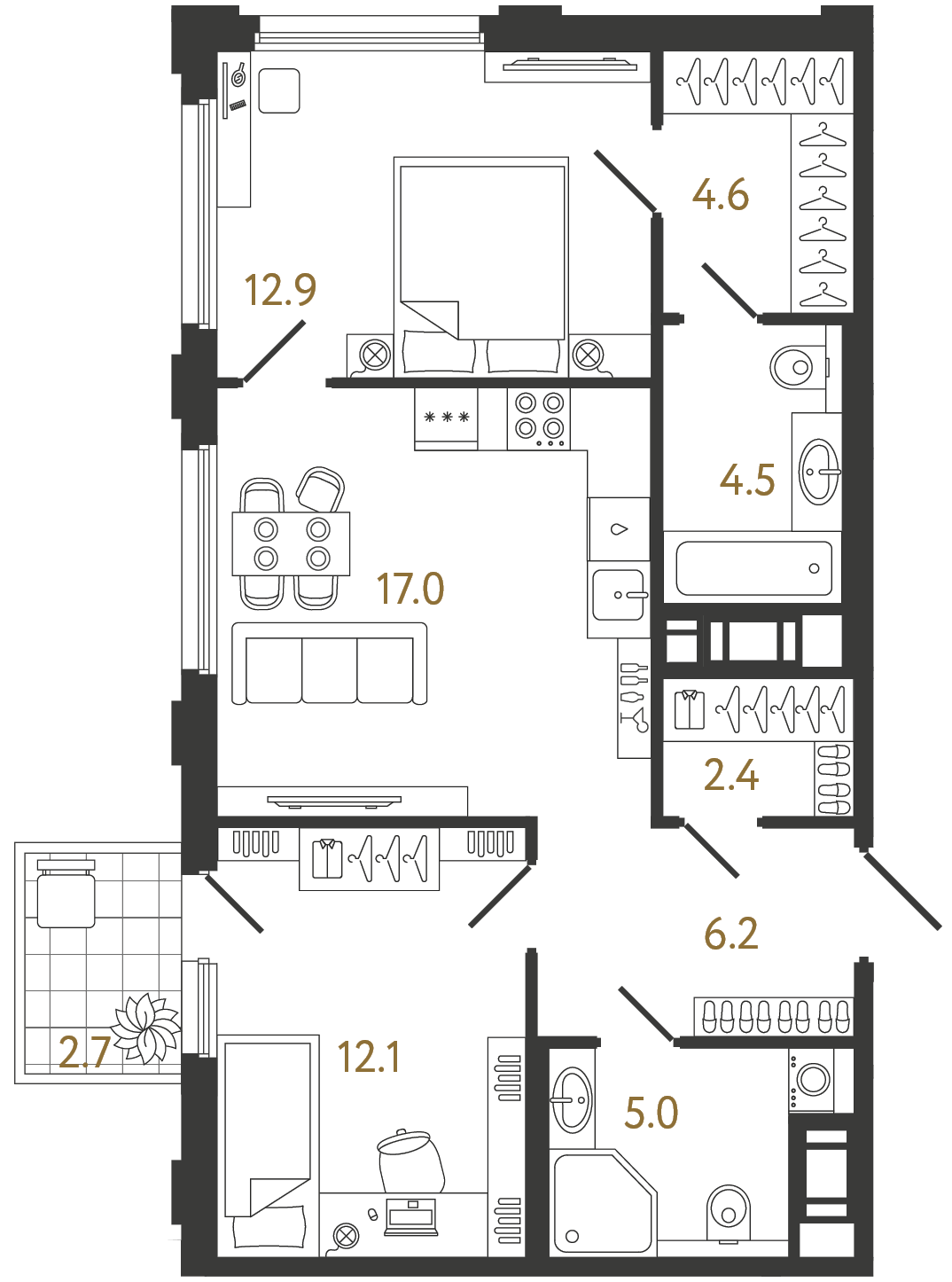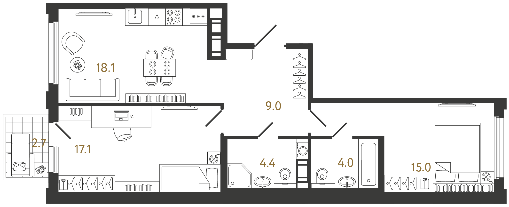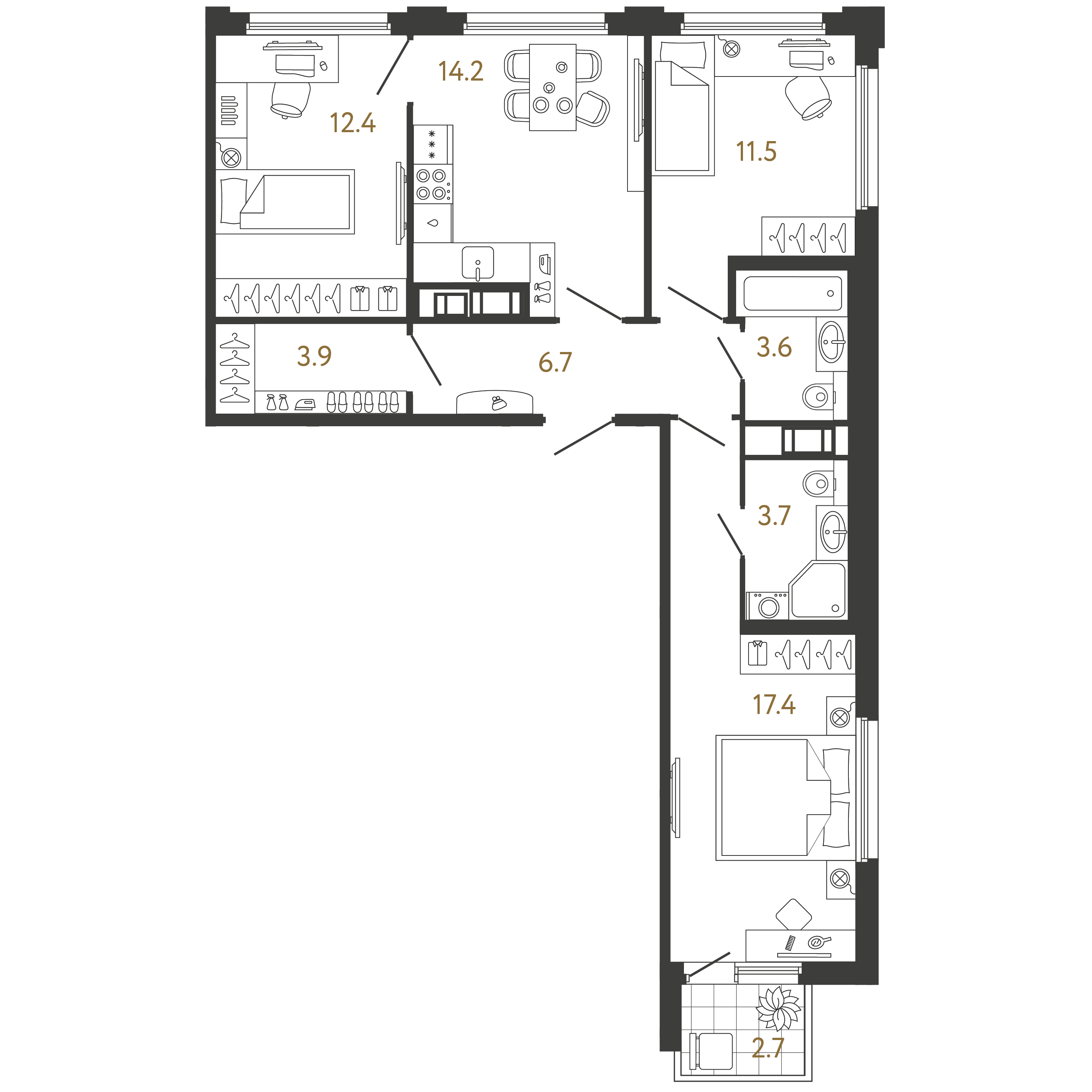 Трехкомнатные квартиры (16 квартир, 5 планировок)