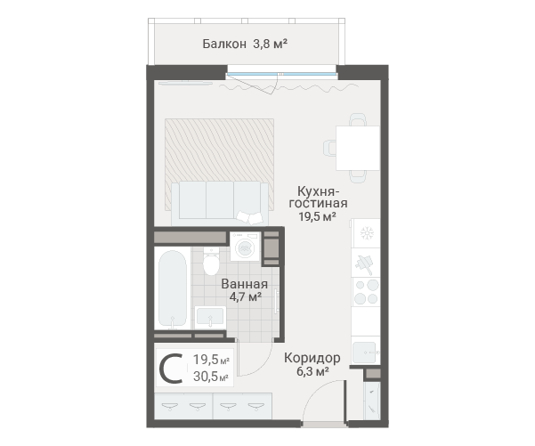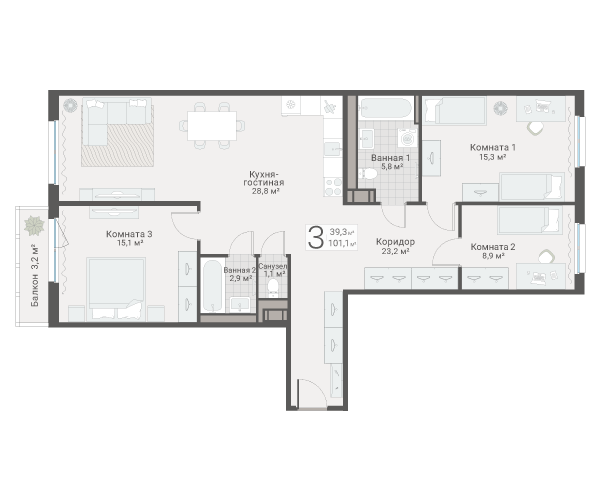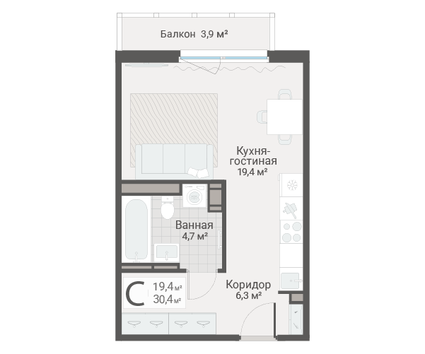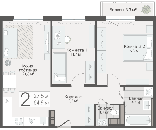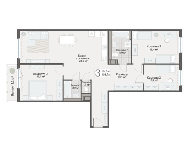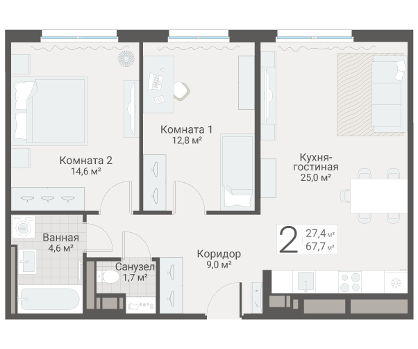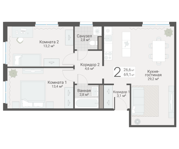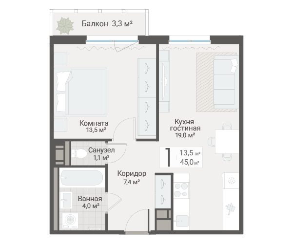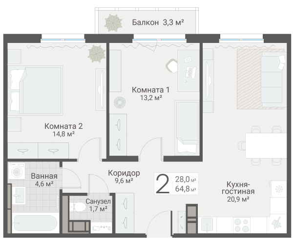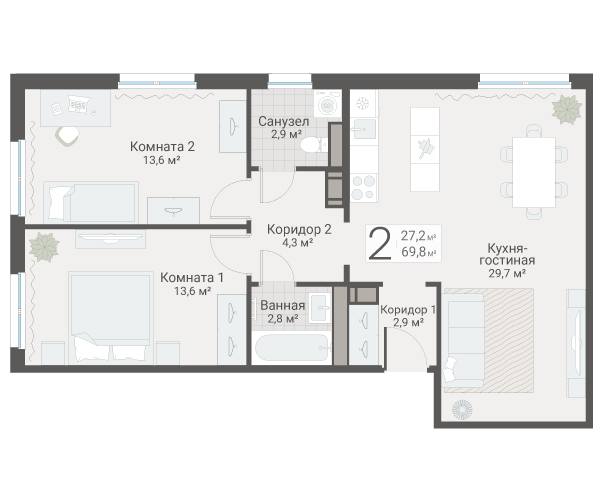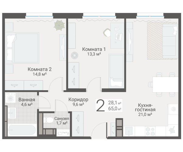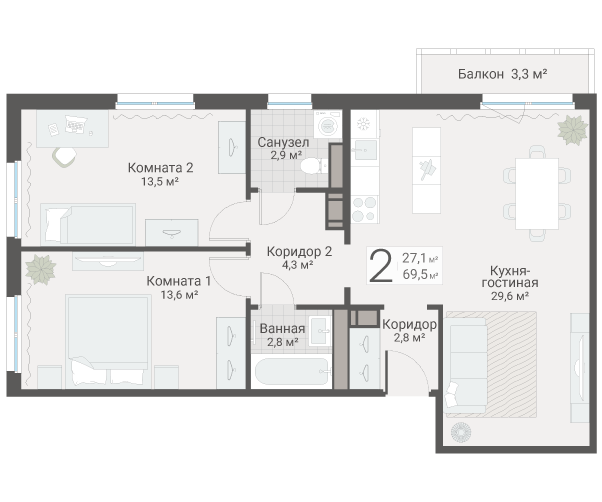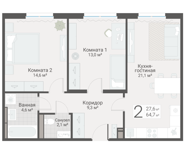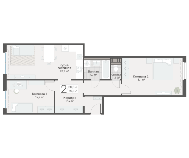 Жилье предлагается в чистовой отделке, форматы планировок от студий до трехкомнатных квартир, площадь от 30 до 100 кв.м. Кухне-гостиные увеличенной площади от 15 до 31 кв.м., часть двухкомнатных квартир идет с окнами в ванных, трехкомнатные квартиры идут с двумя санузлами.