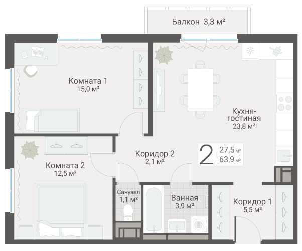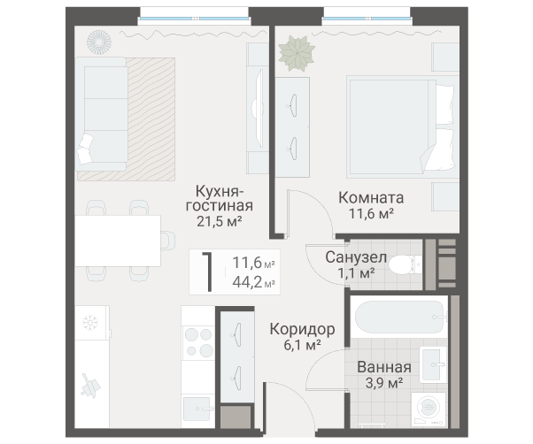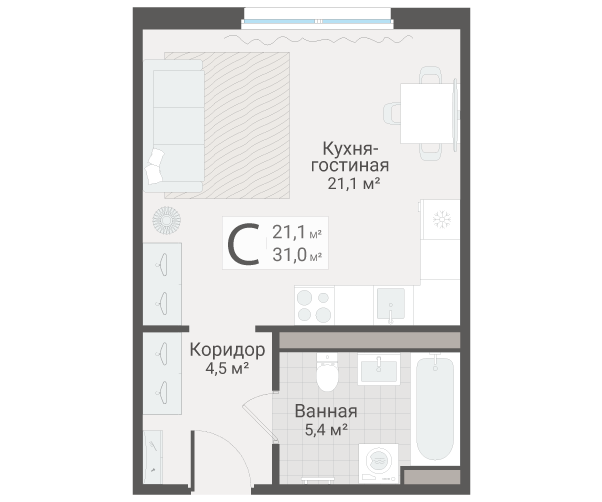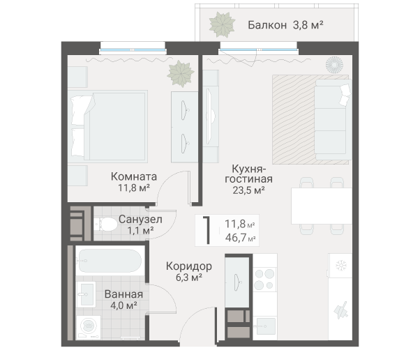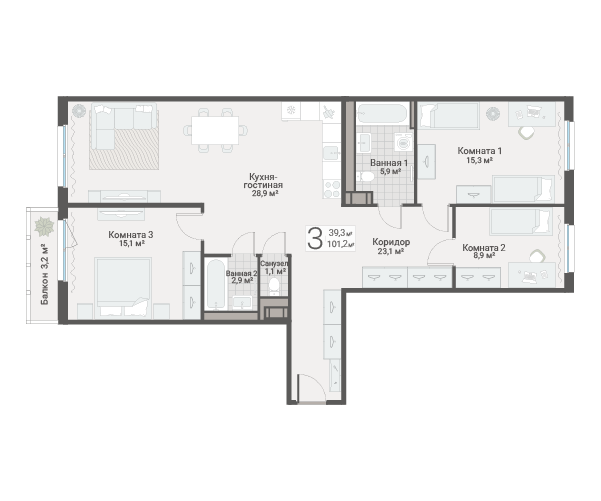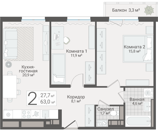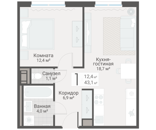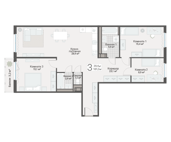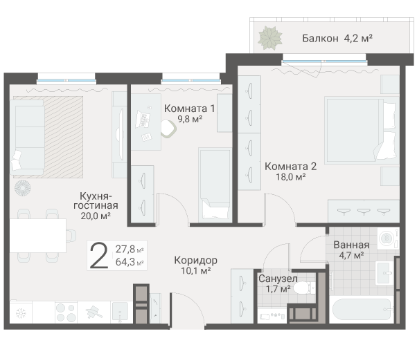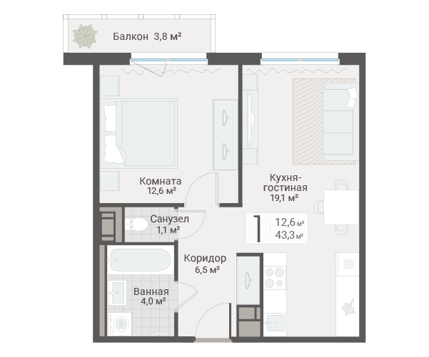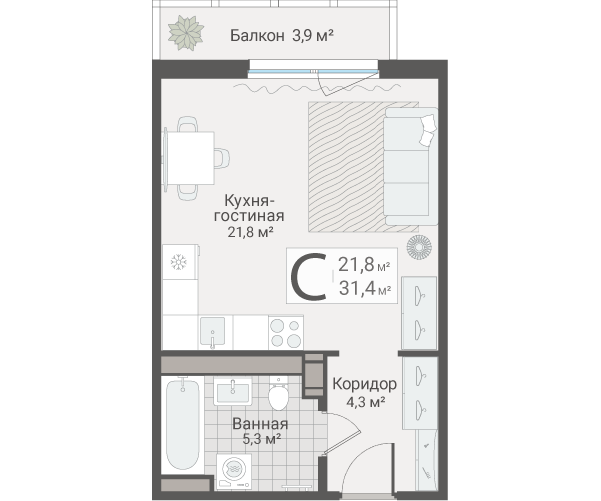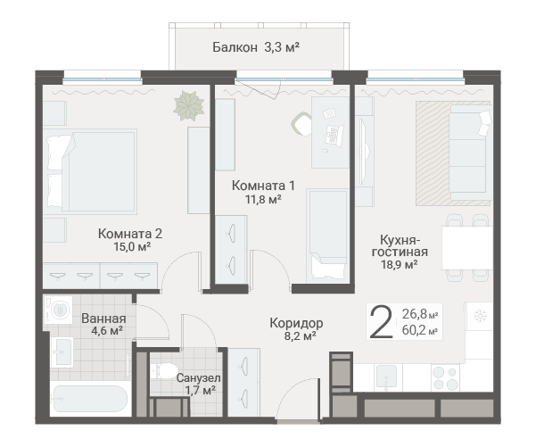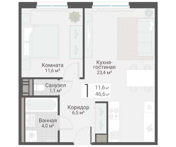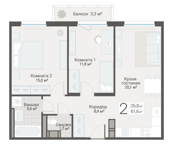 Жилье предлагается в чистовой отделке, форматы планировок от студий до трехкомнатных квартир, площадь от 30 до 100 кв.м. Кухне-гостиные увеличенной площади от 15 до 31 кв.м., часть двухкомнатных квартир идет с окнами в ванных, трехкомнатные квартиры идут с двумя санузлами.