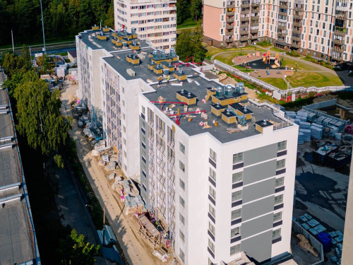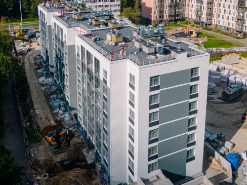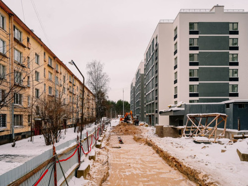 - Завершаются работы по устройству внутриплощадочных наружных сетей. Продолжается отделка в квартирах и МОП, монтаж ИТП и благоустроство. Также специалисты занимаются устройством слаботочных систем и электротехнических устройств, кровли подземного паркинга, инженерных коммуникаций в паркинге.