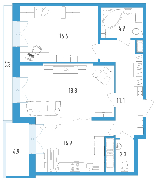 В доме запроектированы одно-, двух-, трех- и четырехкомнатные квартиры площадью 40,6-109.26 кв.м, продаются по ДДУ. Отделка в них проводится под чистовую, балконы и лоджии остеклят. В просторных холлах на первом этаже застройщик выполнить улучшенный ремонт.