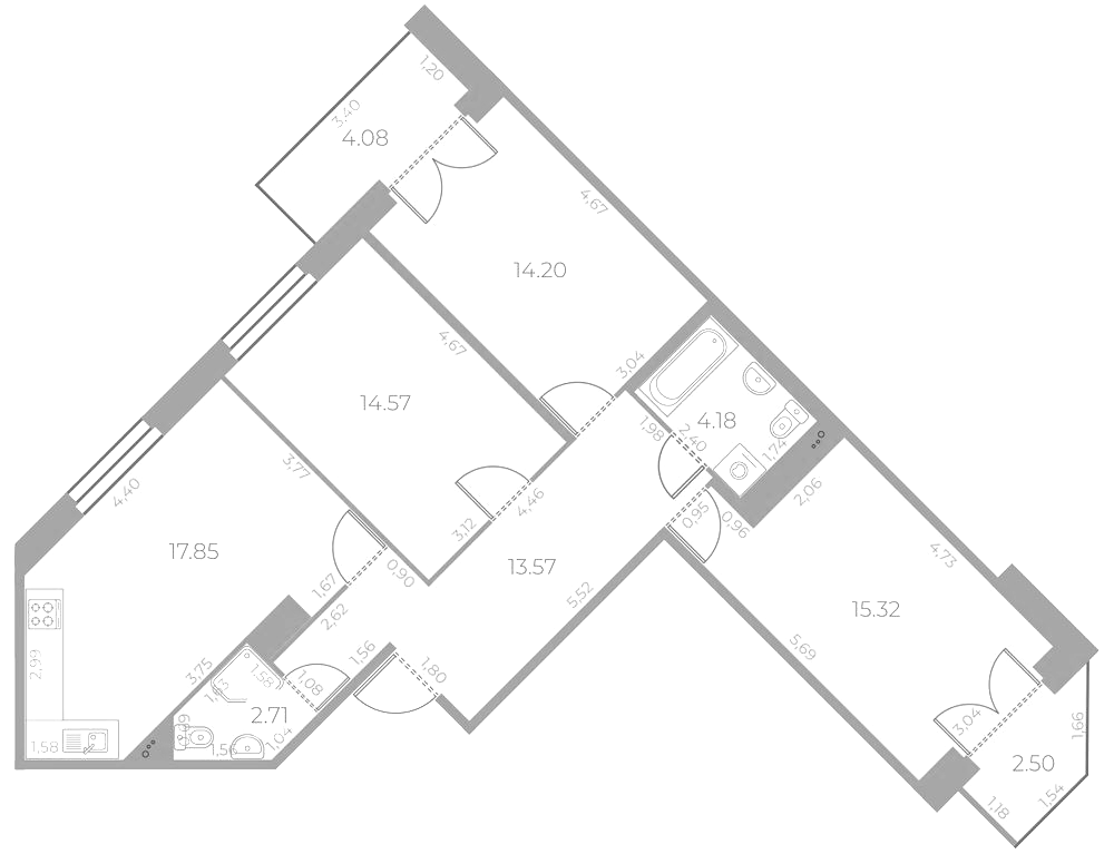 В четвертой очереди треть квартир это студии и однокомнатные, двух- и трехкомнатных квартир больше всего. Площадь студий начинается от 27 кв. м, однокомнатных от 40 кв.м, двухкомнатные будут площадью от 61 кв.м, трехкомнатные от 81 кв.м. К покупке представлены и четырехкомнатные квартиры, их площадь начинается от 98 кв.м. Во всех квартирах будут балконы, выход на них осуществляется через распашные двери. Высота потолка в новой очереди 2.74 м, квартиры передаются в чистовой отделке.