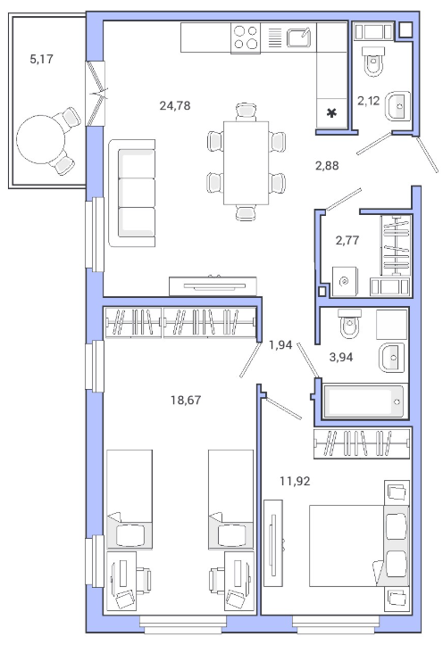 В панельных зданиях квартала "Гатчина" предложены квартиры от студий до трехкомнатных и двухуровневых 4-комнатных площадью 25-83 кв. м. Высота потолков — 2,75 м. На первых этажах планировки с террасами. Отделка жилых помещений предчистовая: