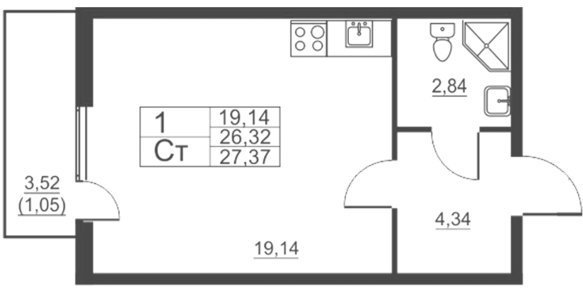 Студия (63 квартиры, 40 планировок)