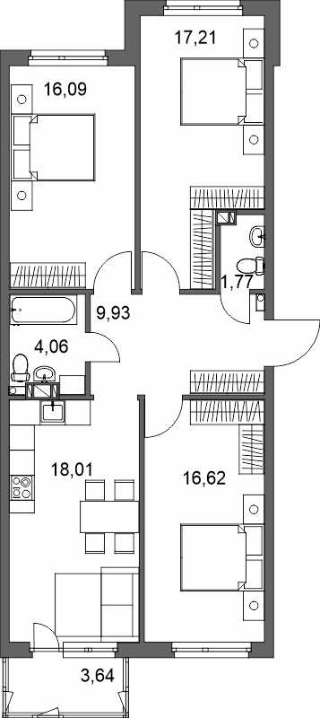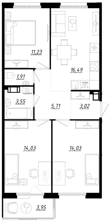 Трехкомнатные квартиры (14 квартир, 14 планировок)