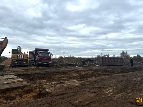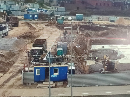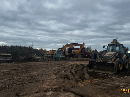 - Выполняется устройство сетей хозбытовой и ливневой канализации для первого этапа строительства.