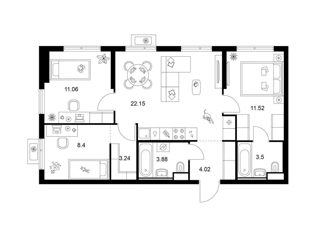 Трехкомнатные квартиры (12 квартир, 5 планировок)