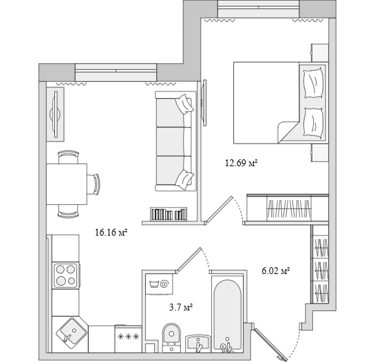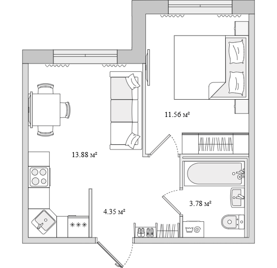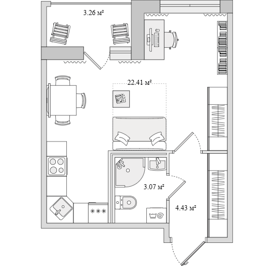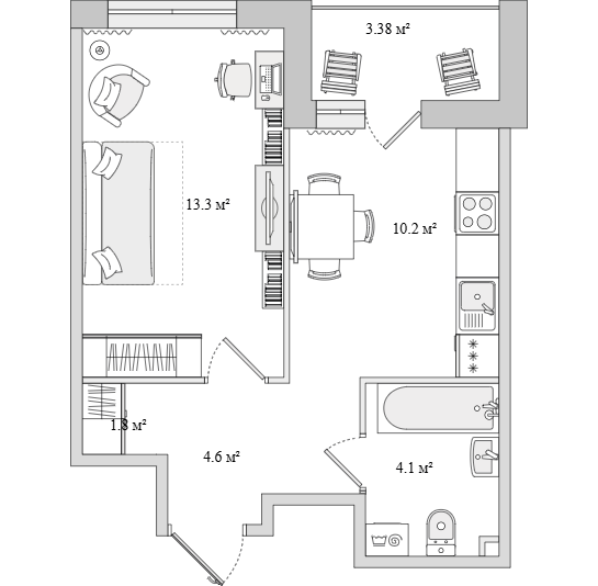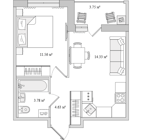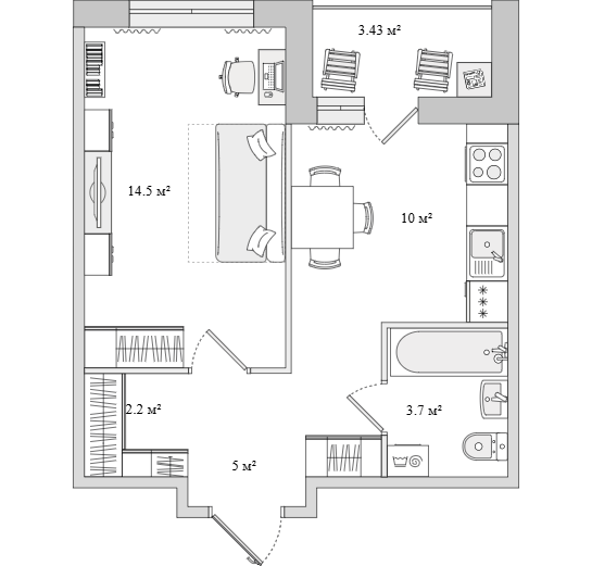 Однокомнатные квартиры (14 квартир, 14 планировок)