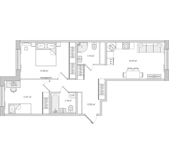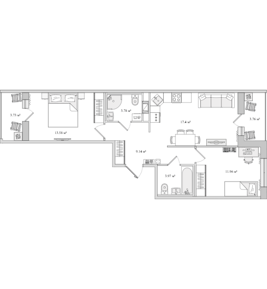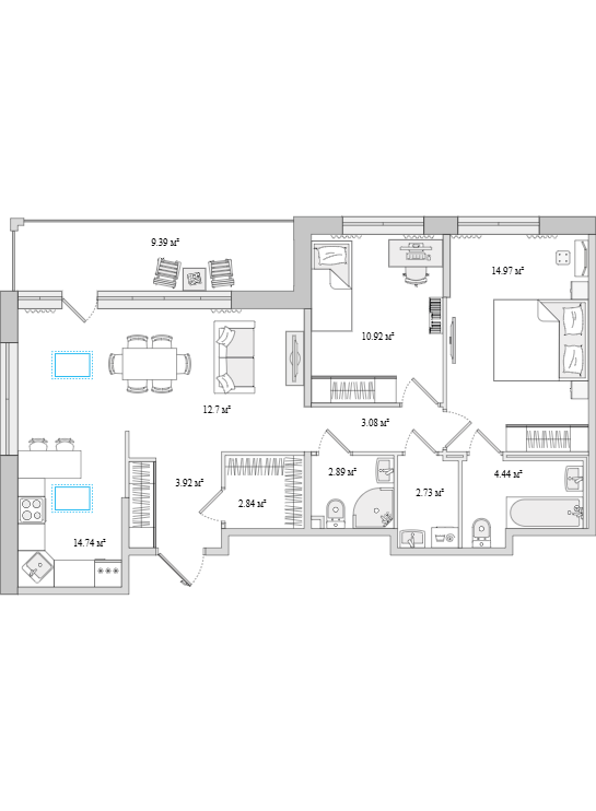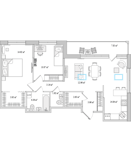 Площадь жилья от 28 до 113 квадратных метров. Предусмотрено около 20 типов планировок, от студий до еврочетырехкомнатных. Высота потолков 2,75 м. На последнем этаже квартиры с зенитными окнами (размещены на крыше).