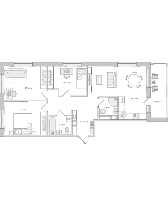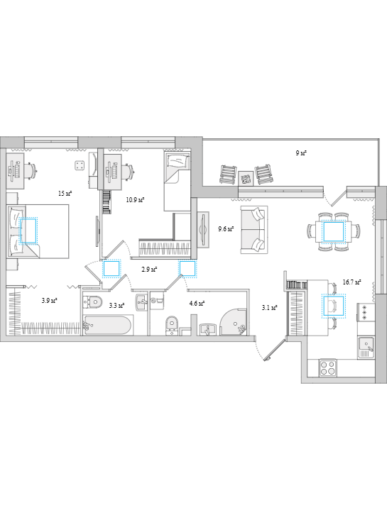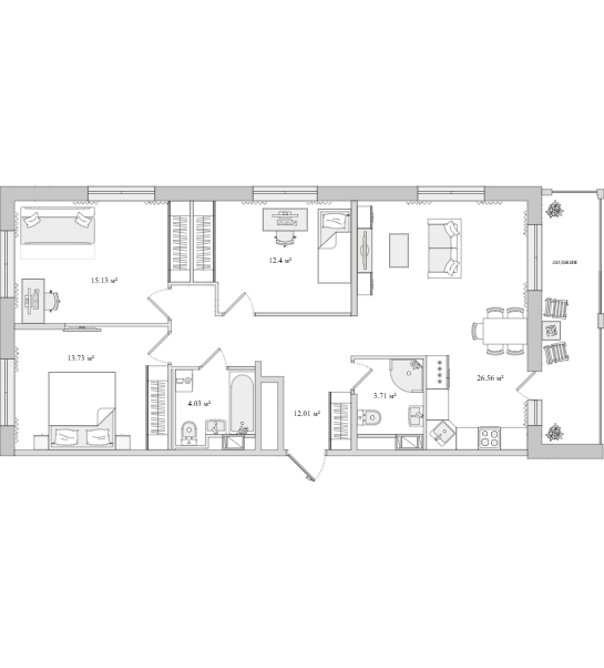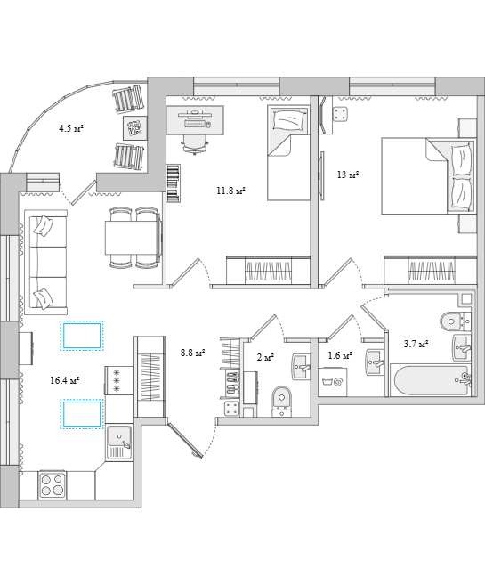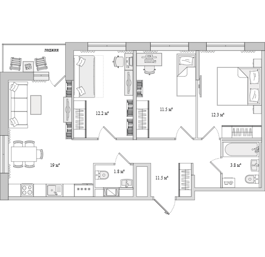 Трехкомнатные квартиры (13 квартир, 13 планировок)