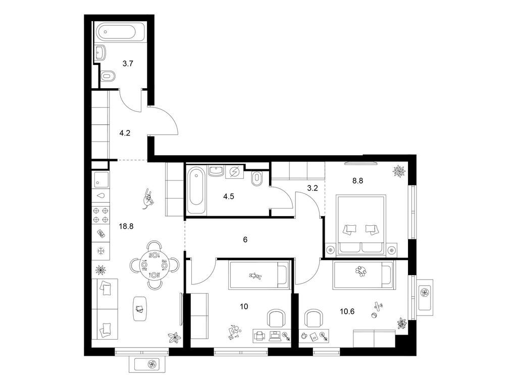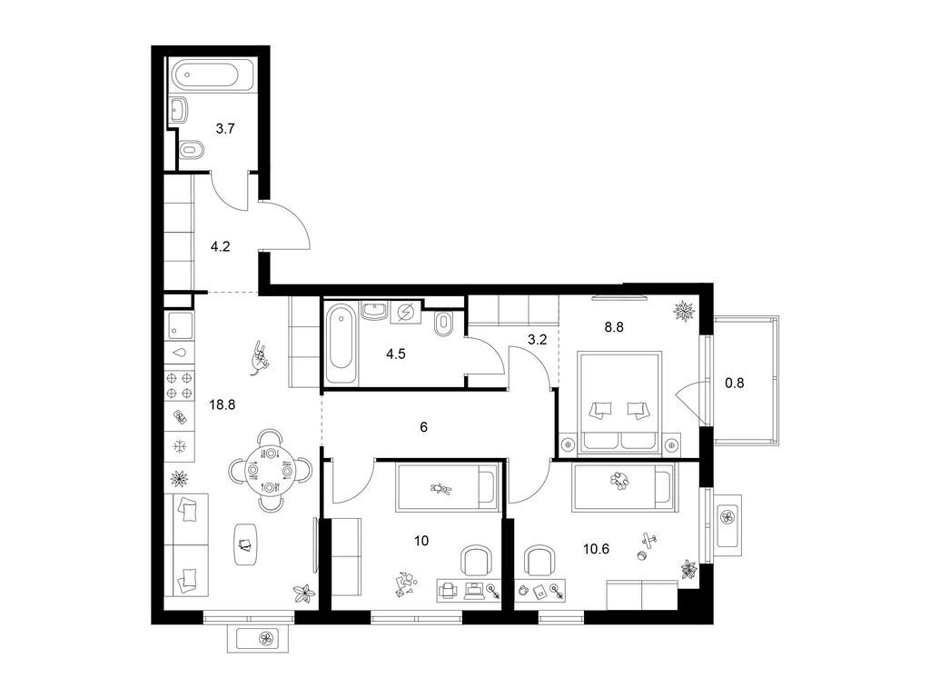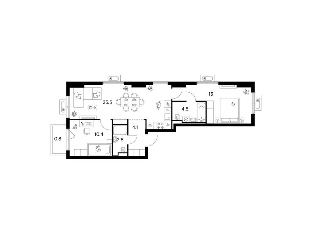 В составе первой очереди четыре 12-этажных корпуса. Покупателям предлагаются студии, 1-, 2- и 3-комнатные квартиры с чистовой отделкой. Площадь жилья от 26 до 86 кв. м. Для хранения сезонных вещей в подвале предусмотрены индивидуальные кладовые.