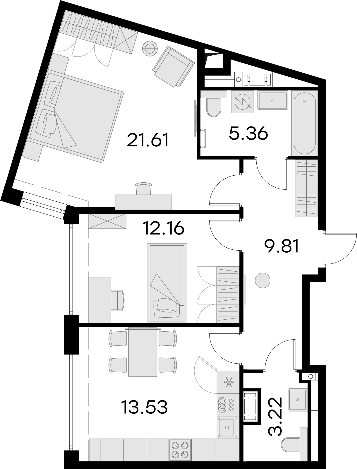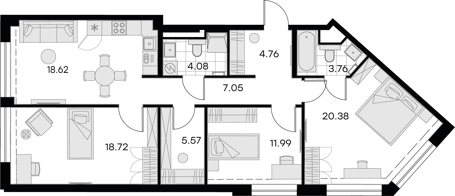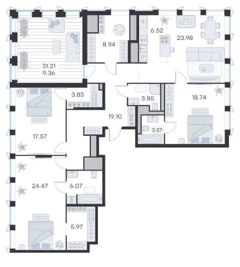 В комплексе предложены студии и 1-4-комнатные квартиры с предчистовой отделкой. Среди вариантов двухуровневые со вторым светом, шесть пентхаусов с каминами и террасами, лоты с выходом окон на три стороны. В многокомнатных есть гардеробные, мастер-спальни и кухни-гостиные. 80% квартир с видовыми характеристиками. Высота потолков три метра, на последнем этаже — 3,3 м. Площадь жилья от 30,62 до 139,61 кв. м.