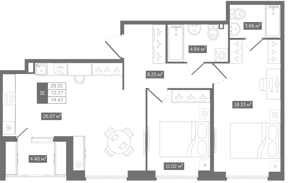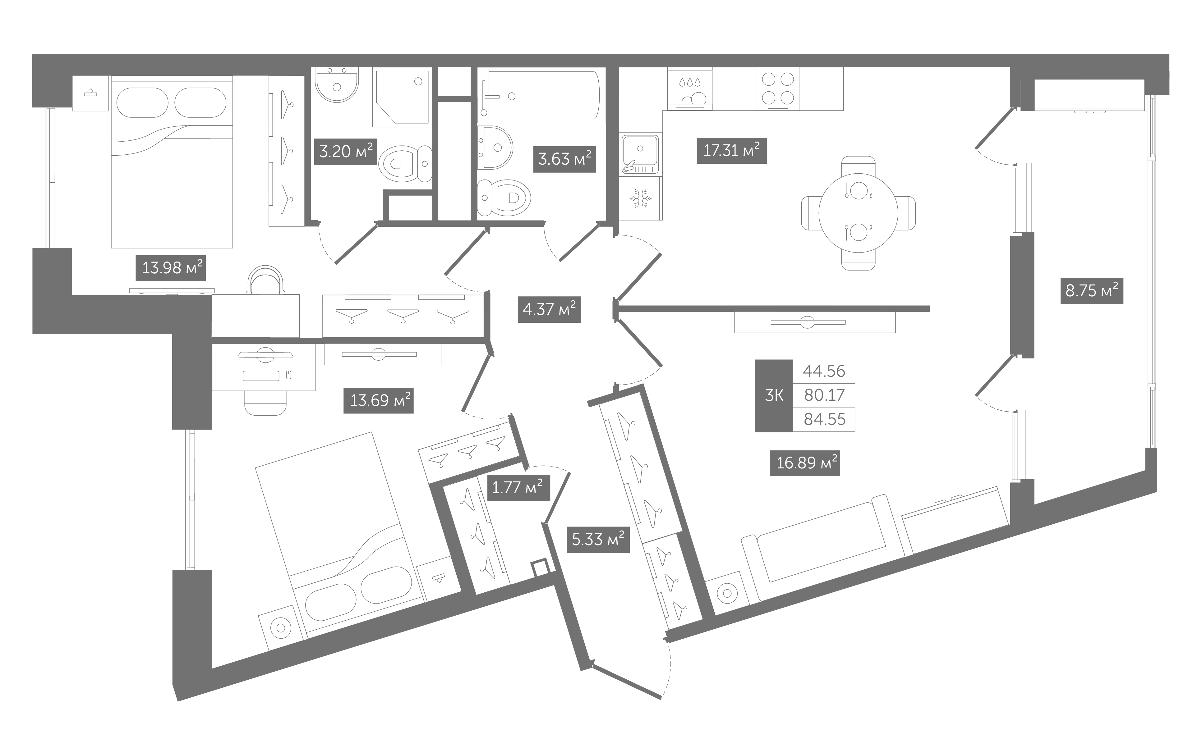 Трехкомнатные квартиры (9 квартир, 5 планировок)