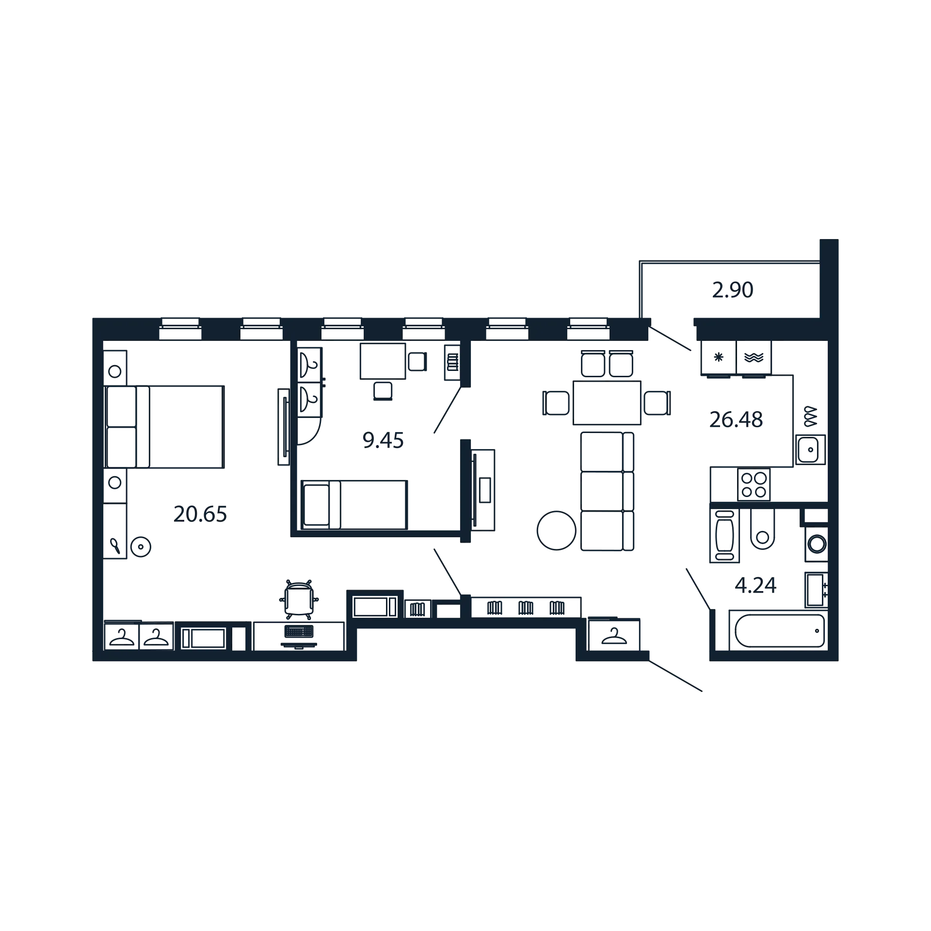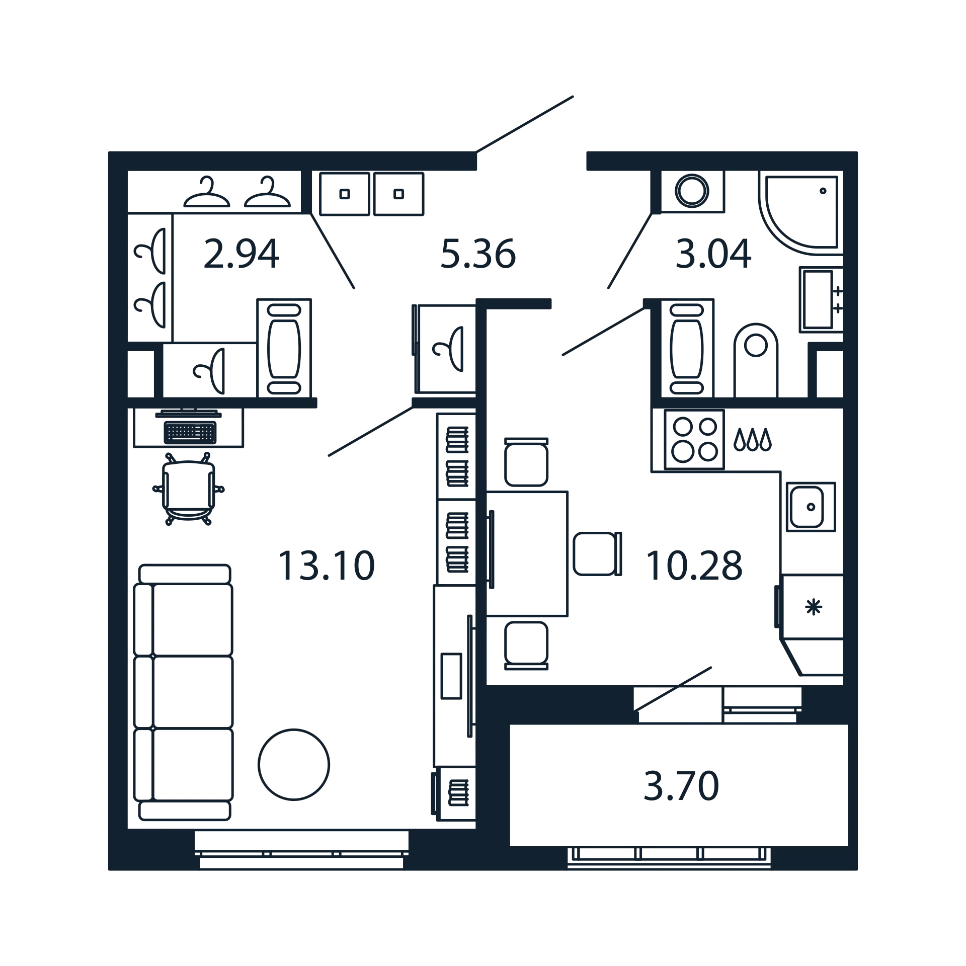 В кирпично-монолитных домах 2085 квартир. Самый большой корпус под номером 1 — в здании 1305 планировок. Покупателям предложены варианты от студий до еврочетырехкомнатных площадью 20-94 кв. м. Некоторые лоты с французскими балконами и открытыми террасами. Высота потолков 2,77 м, только на последних этажах увеличена до 3,3 метра. Часть жилья сдается с отделкой под чистовую, часть — с финишным ремонтом в скандинавском стиле.