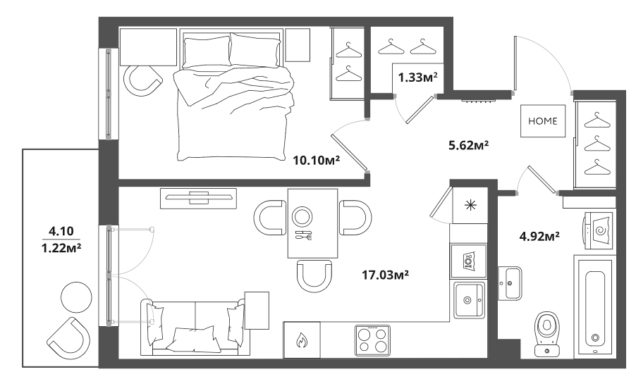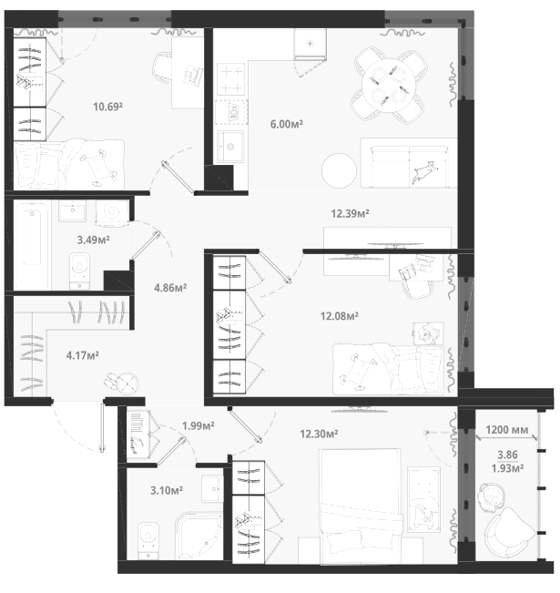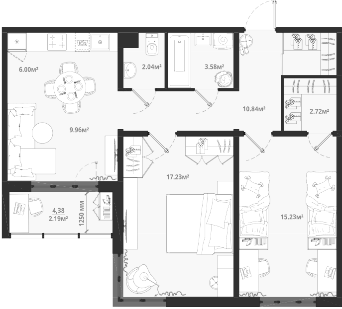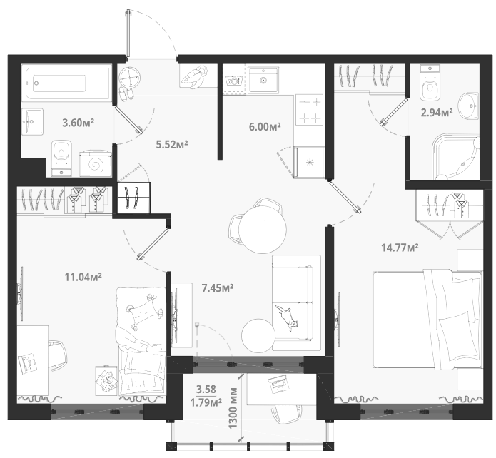 В первом доме 973 квартиры, в среднем по шесть на этаже. Есть студии, одно- и двухкомнатные планировки. Часть жилья с гардеробными, кухнями-гостиными и мастер-спальнями. Застройщик выполнит финишную отделку в светлых тонах.