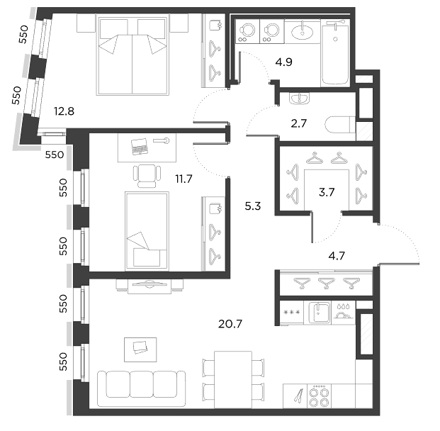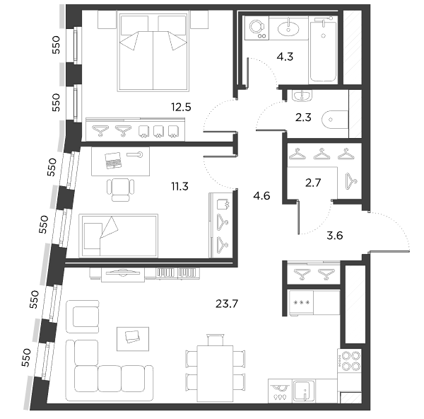 Двухкомнатные квартиры (3 квартиры, 3 планировки)