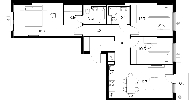 Трехкомнатные квартиры (4 квартиры, 4 планировки)