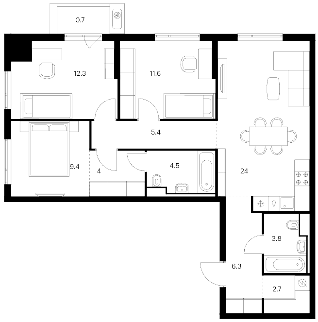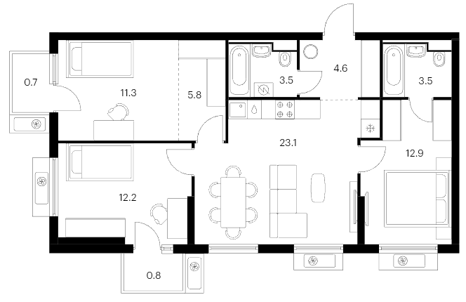 Трехкомнатные квартиры (5 квартир, 5 планировок)
