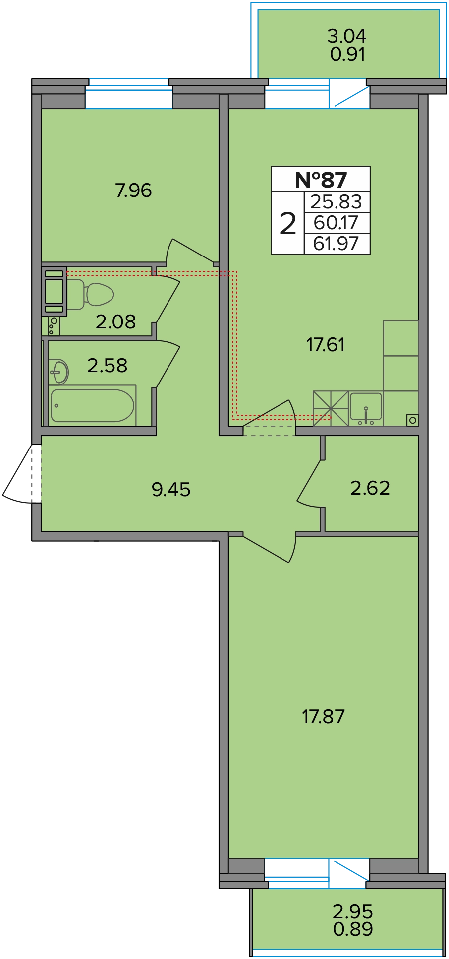 В доме 220 квартир, из которых 50 квартир двушки, 9 квартир трешки, остальные - студии и однокомнатные квартиры. Площадь жилья варьируется от 23 до 83 кв.м. Высота потолка 2,7 м. Квартиры передаются без отделки.
