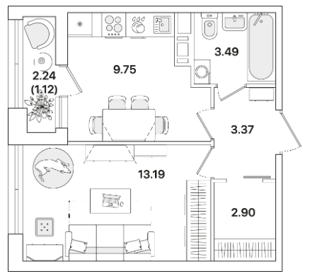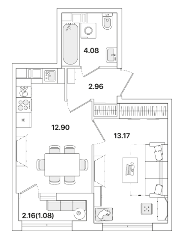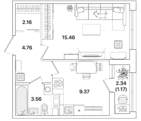 Однокомнатные квартиры (5 квартир, 4 планировки)