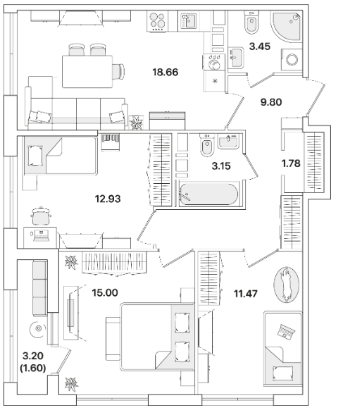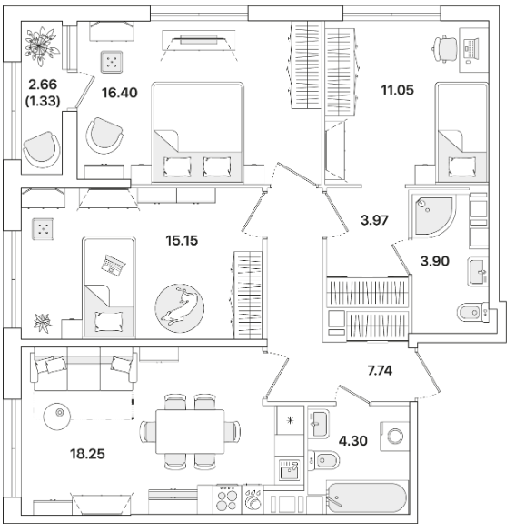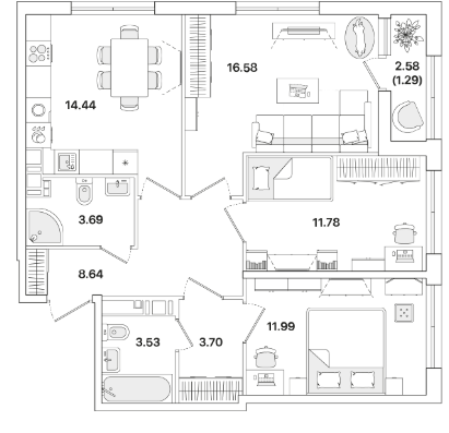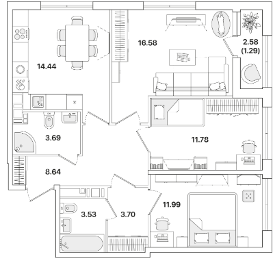 Трехкомнатные квартиры (8 квартир, 8 планировок)