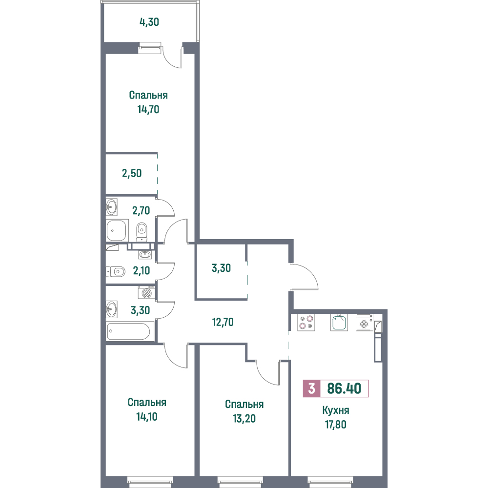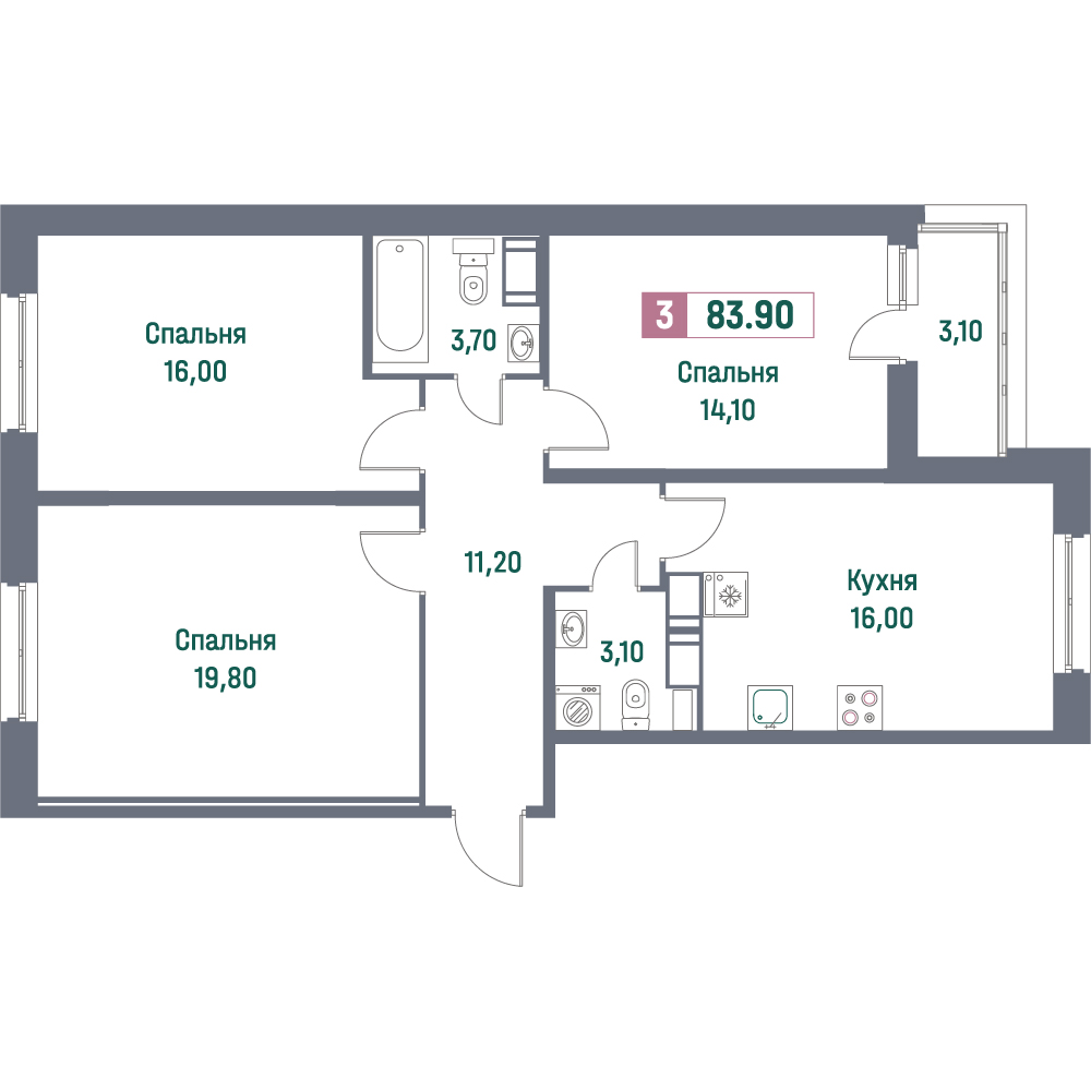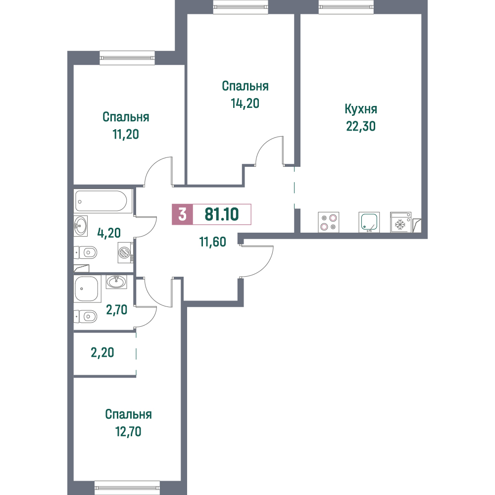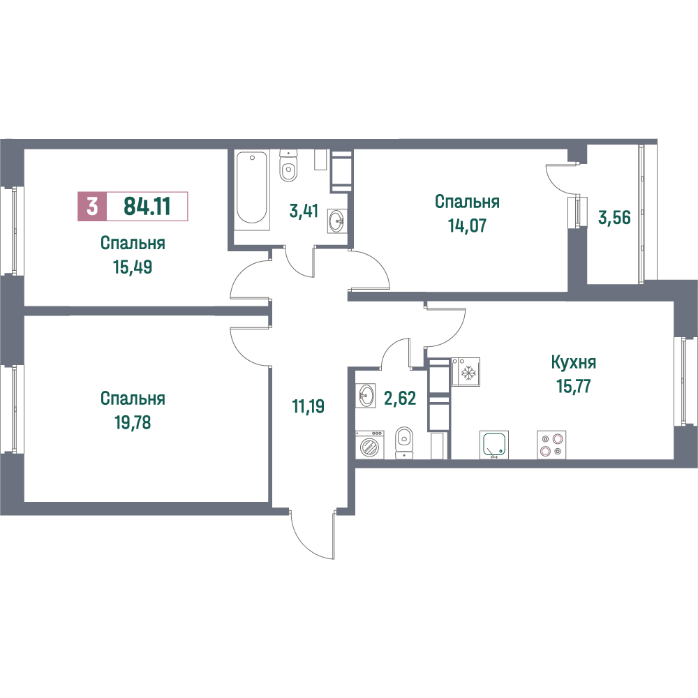 Трехкомнатные квартиры (101 квартира, 55 планировок)