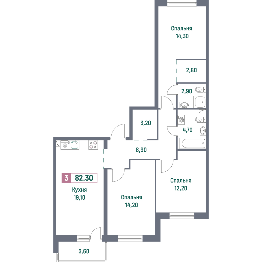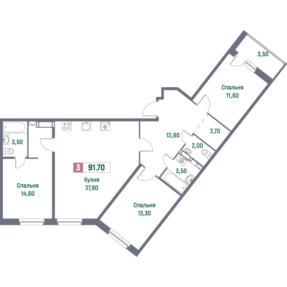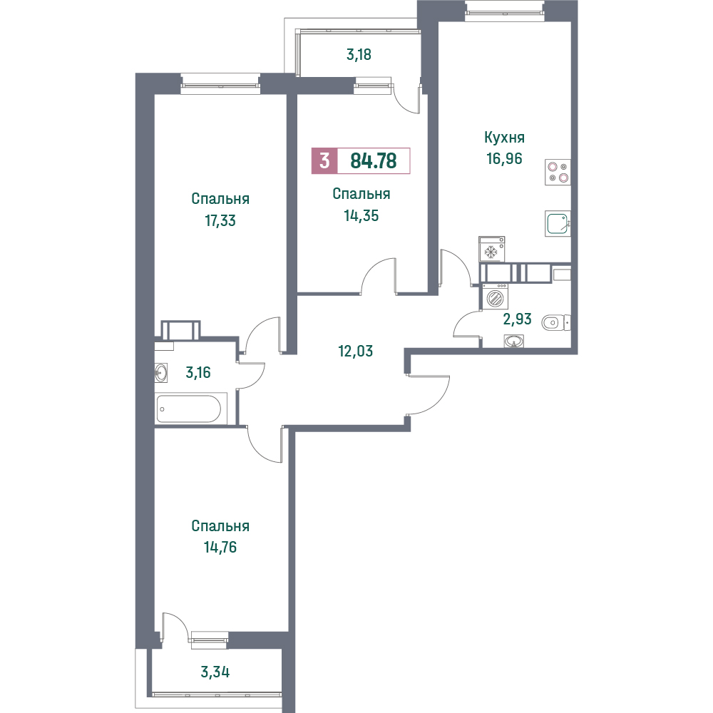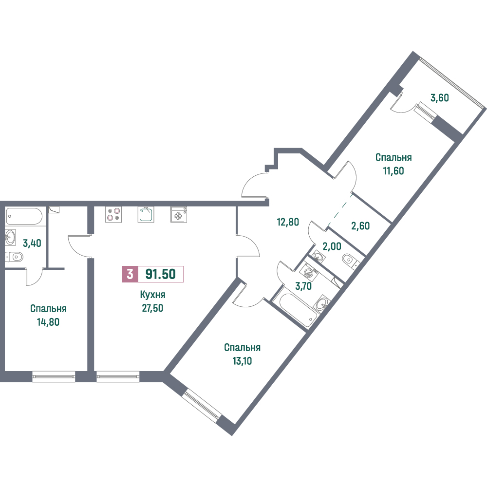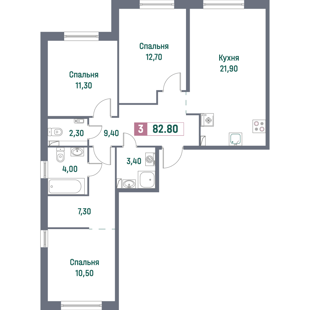 Трехкомнатные квартиры (101 квартира, 55 планировок)