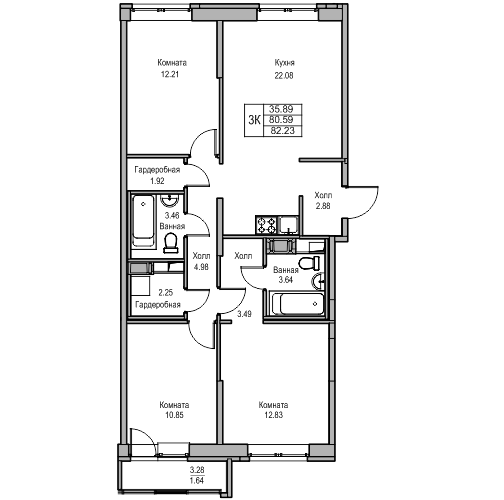 Трехкомнатные квартиры (5 квартир, 5 планировок)