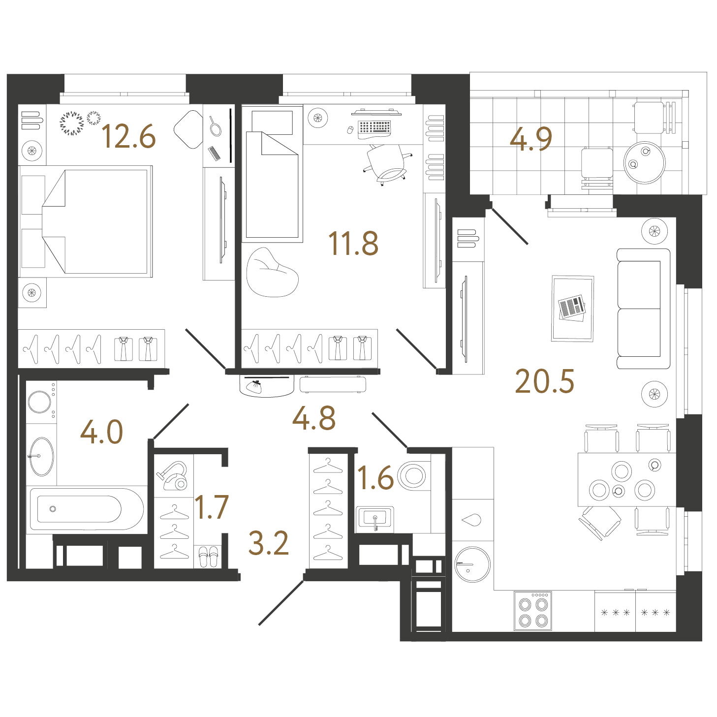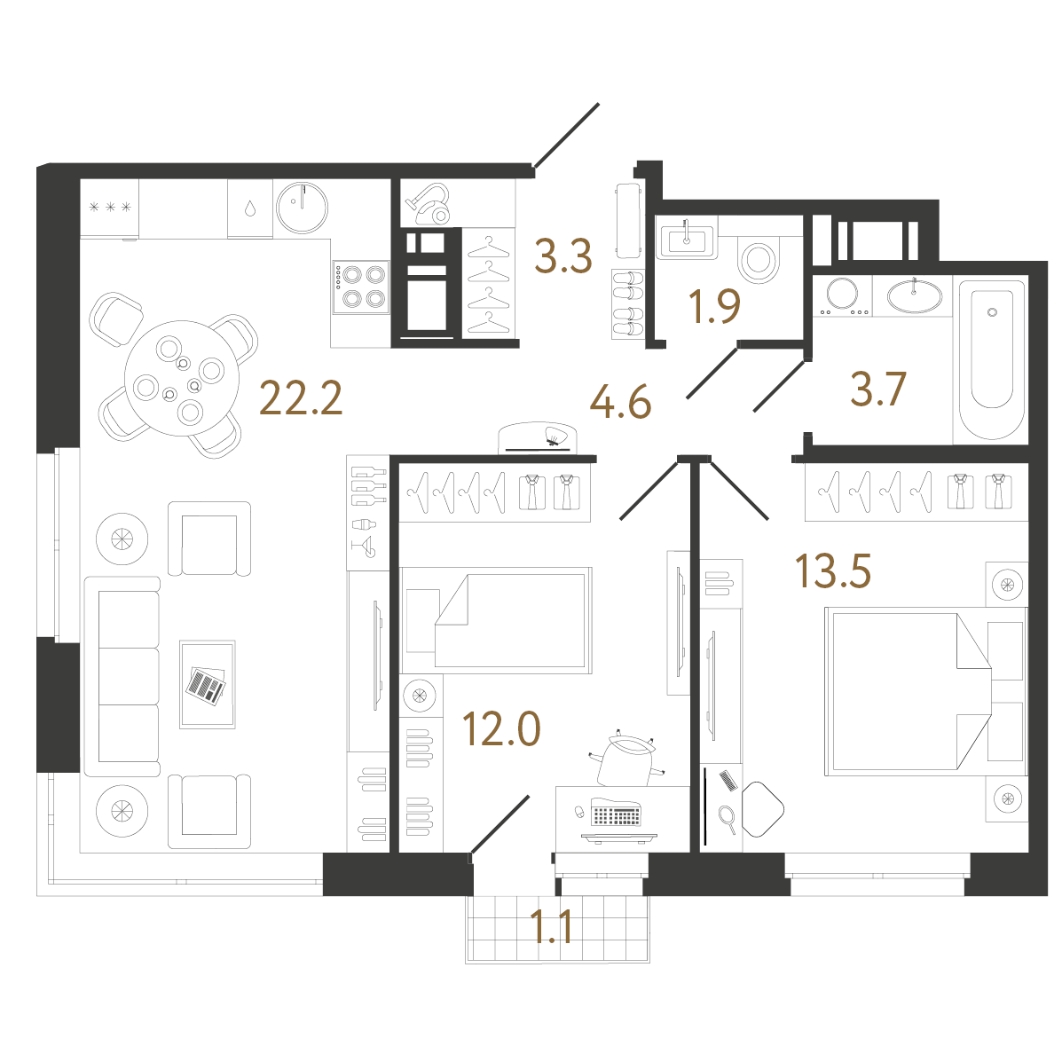 Квартиры представлены от 24 до 121,1 кв.м, на верхних этажах будут расположены квартиры с террасами, обладающими видовыми характеристиками. Предложены квартиры с эркерами, угловыми окнами и французскими балконами. Высота потолка зависит от этажа, на 10-12 этаже потолки 3 метра, на типовых этажах 2,7 м.