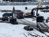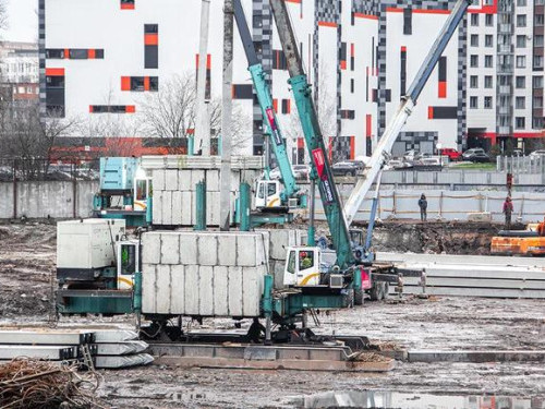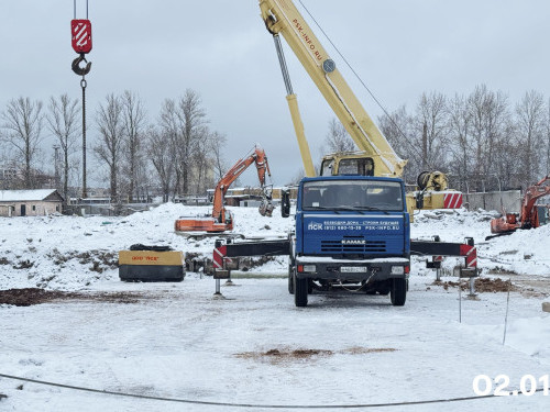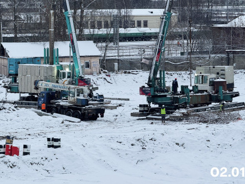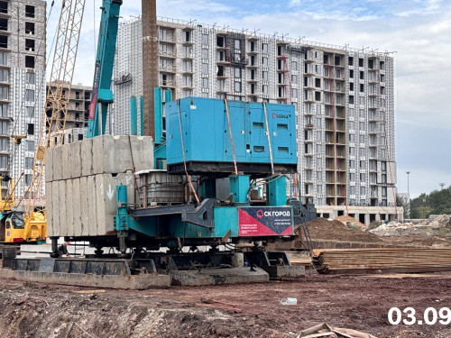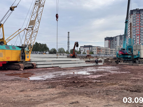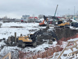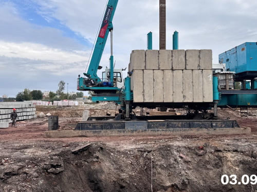 - Под будущим корпусом №2 установлены и запущены еще два крана. Закончены работы по устройству свайного поля.