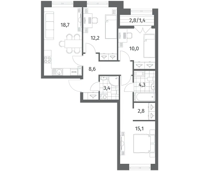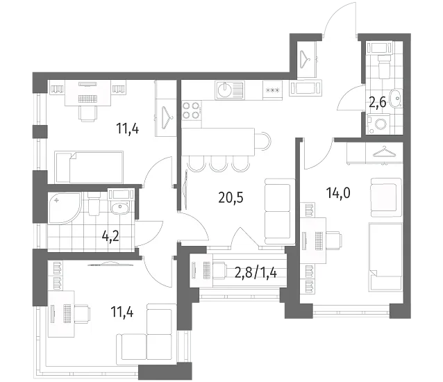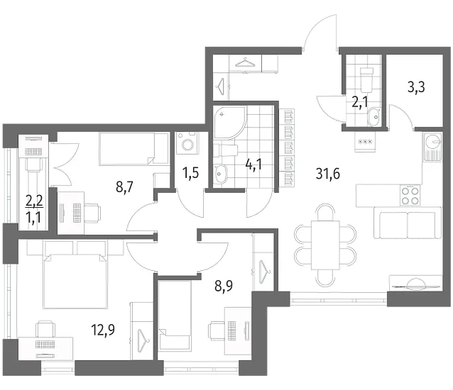 Трехкомнатные квартиры (8 квартир, 8 планировок)