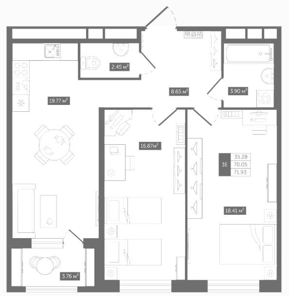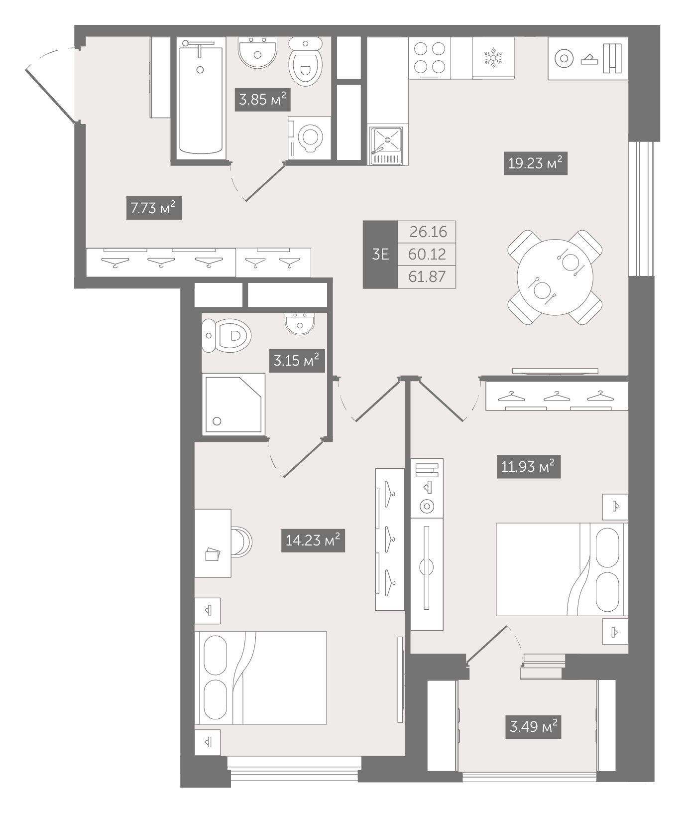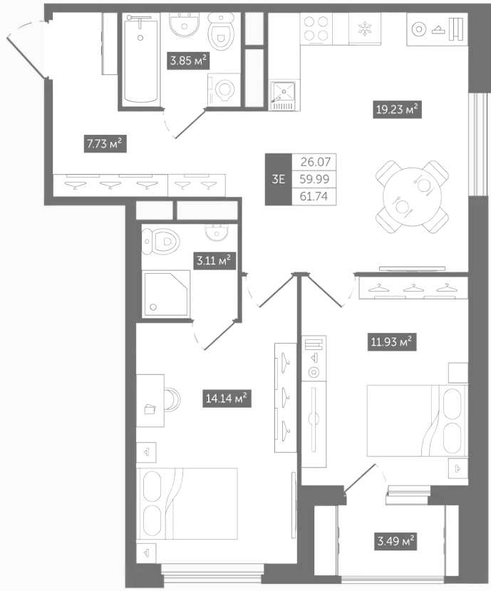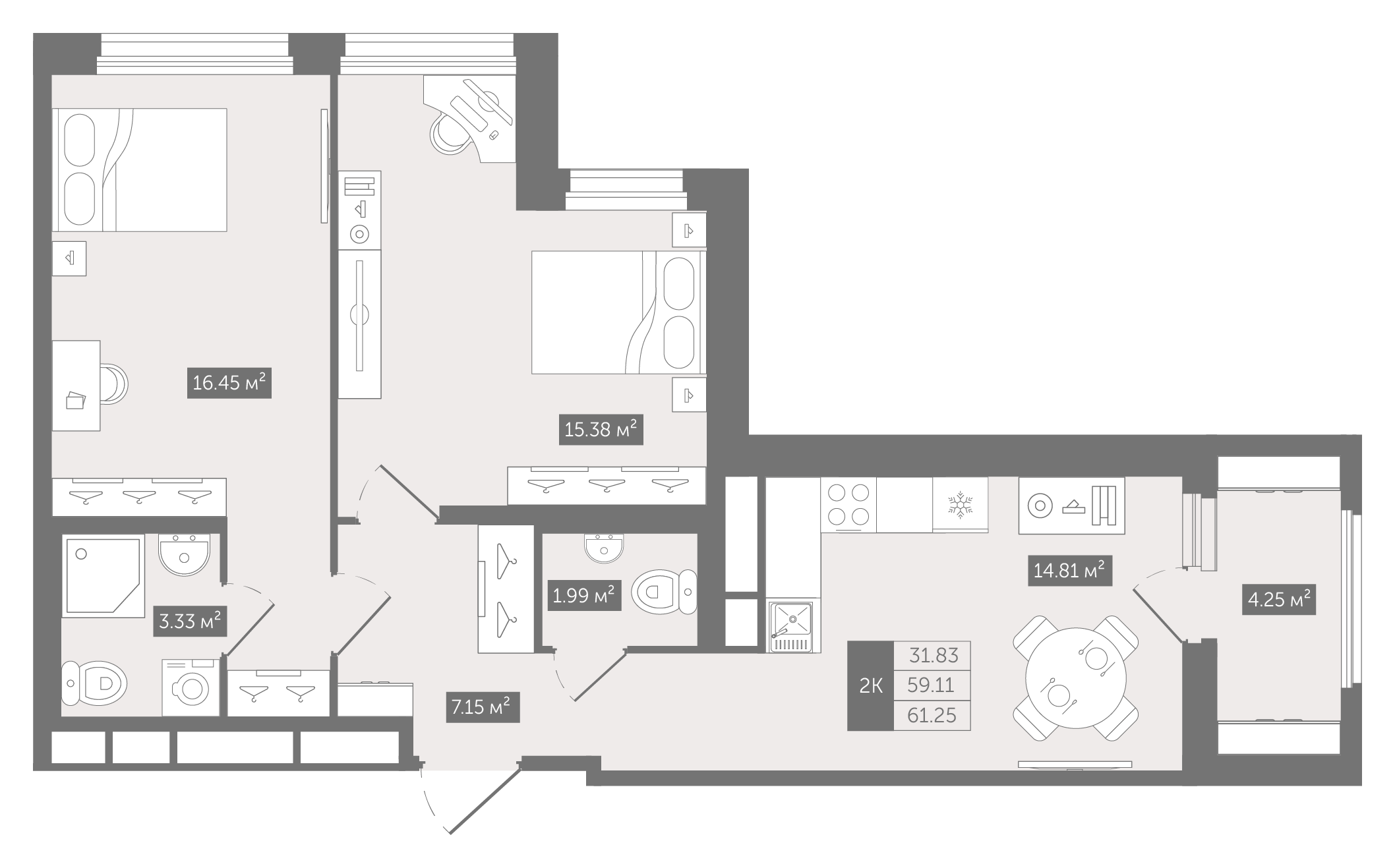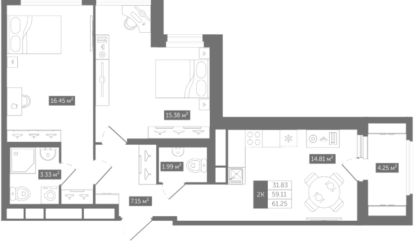 Двухкомнатные квартиры (3 квартиры, 3 планировки)