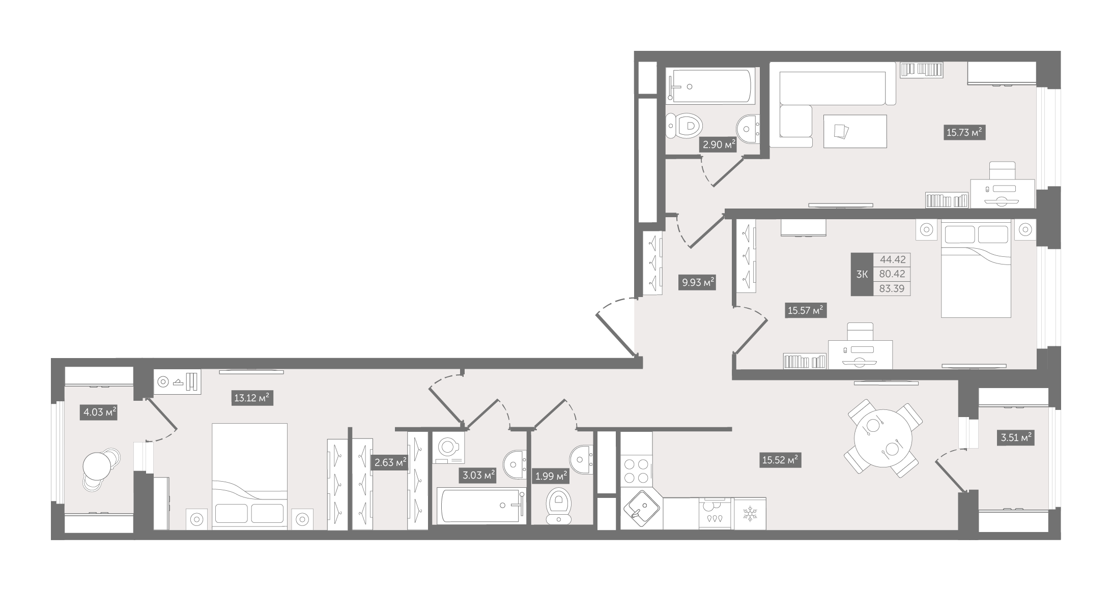 | 83.39 м2 | 44.42 | 15.52 | 11 этаж | 2 кв 2026 | 126 805 a/м2 | 10 574 269 руб |