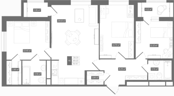 | 92.67 м2 | 39.29 | 28.63 | 8 этаж | 2 кв 2026 | 130 445 a/м2 | 12 088 338 руб |