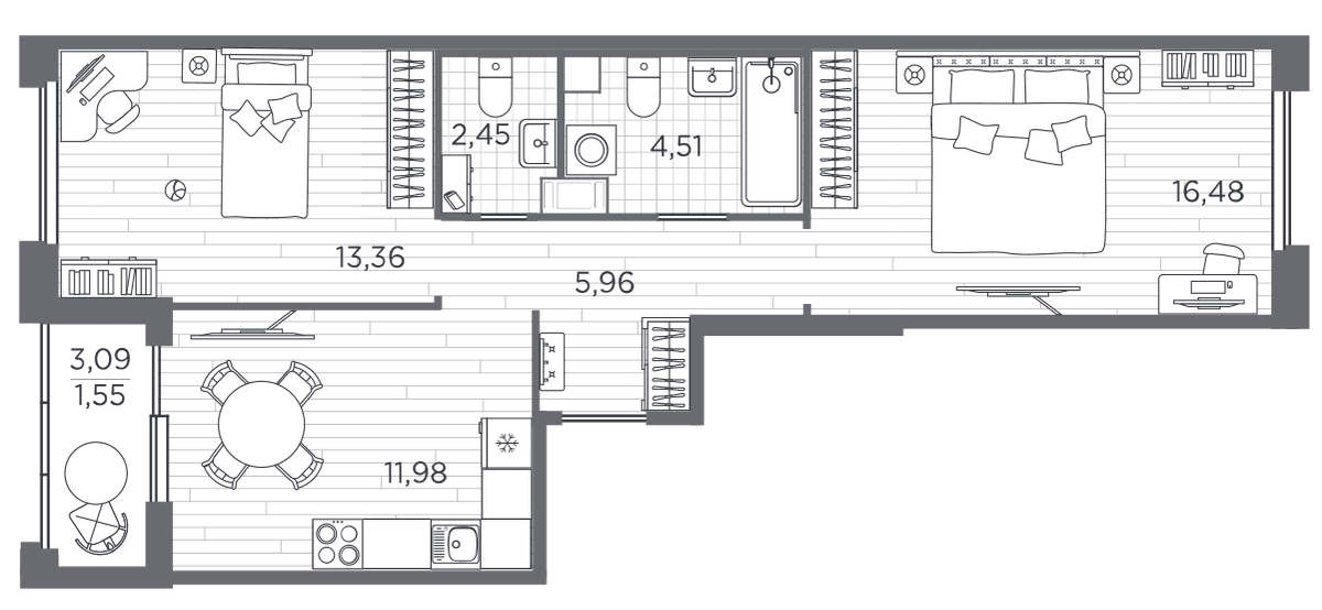 Двухкомнатные квартиры (44 квартиры, 29 планировок)