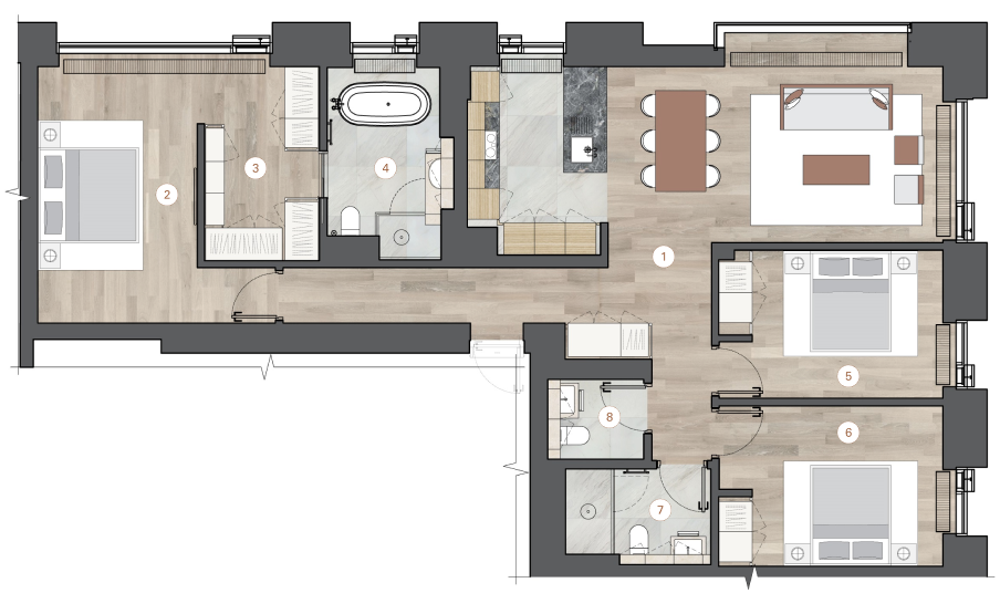 Застройщик установит высокие 2,6-метровые окна, из части которых откроются виды на Крестовский остров, раздвижные двери к французским балконам и широкие подоконники. Кухни оборудуют встроенной техникой Miele и мраморными столешницами. Во входной зоне — стиральная машина и сушильный аппарат Miele. Все спальни со встроенными или примыкающими к ним гардеробными.