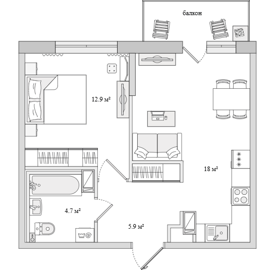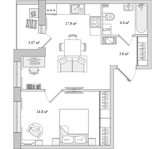 Однокомнатные квартиры (3 квартиры, 3 планировки)