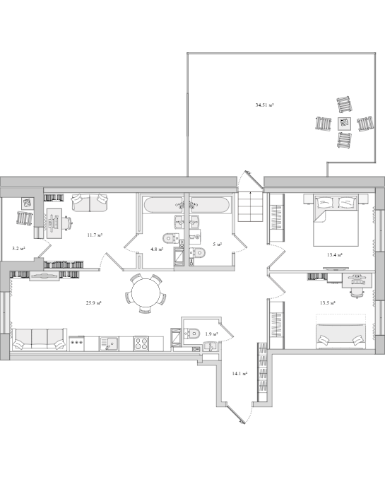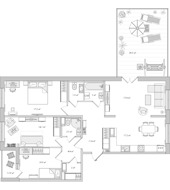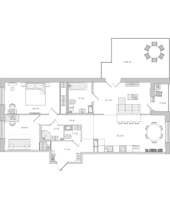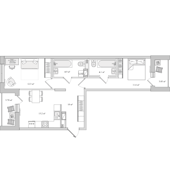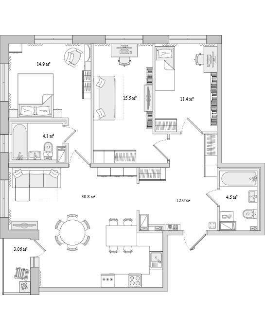 Каждая планировка предусматривает наличие гардеробной, в некоторых есть постирочные, а в квартирах с более чем одной комнатой по два-три санузла.