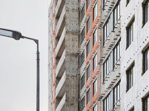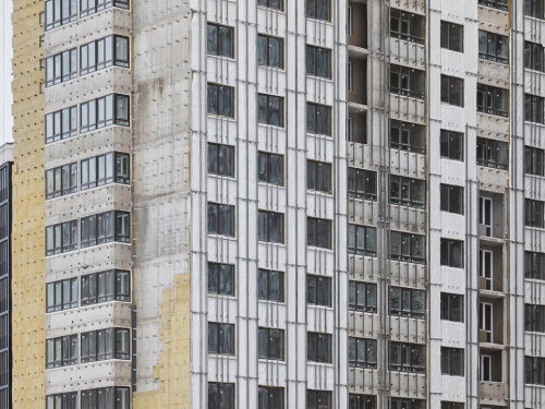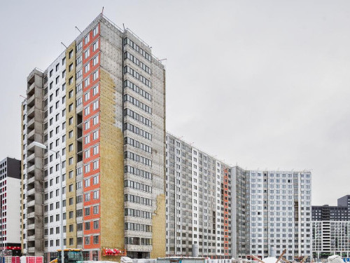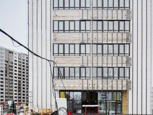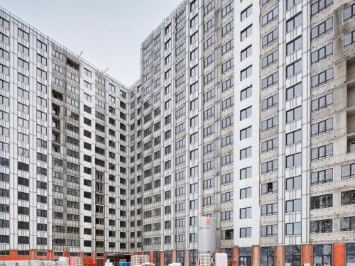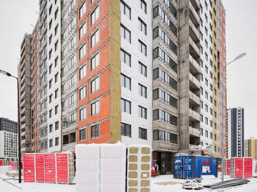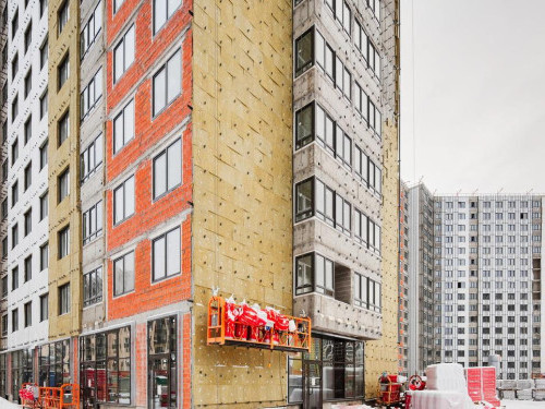 - Ведутся работы по устройству вентилируемого фасада, 1 секция, готовность 30%; 2 секция, готовность 50%.
